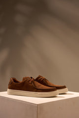 O Tênis Flow traz elegância atemporal com cabedal em camurça marrom e solado branco contrastante. Ideal para um visual casual-chic, combina com jeans, sarja ou alfaiataria descontraída. Confortável, resistente e versátil para o dia a dia ou momentos especiais.